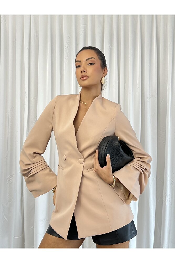 Kolu Büzgü Detaylı Astarlı Kadın Orta Boy Günlük Özel Gün Blazer Ceket