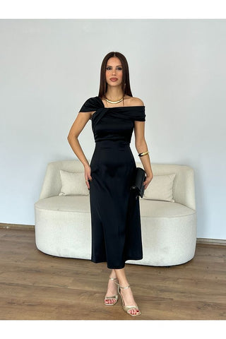 Düşük Omuzlu Saten Midi Elbise