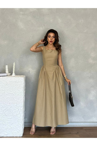 Kare Yaka Kalın Askılı Uzun Boy Yandan Büzgü Detaylı Airobin Günlük Elbise