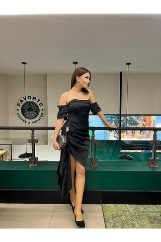 Gold Toka Detaylı Asimetrik Saten Elbise
