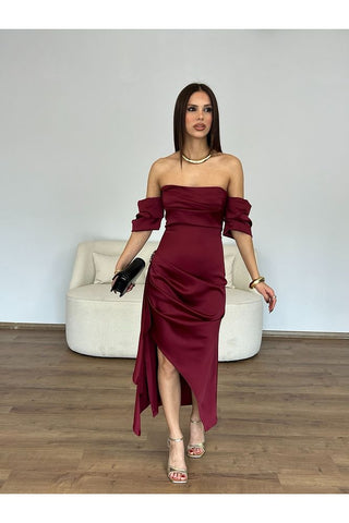 Şifon Detaylı Uzun Boy Vücudu Saran Gece Mezuniyet Nişan Kadın Elbise