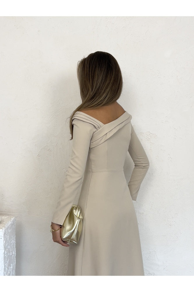 Kayık Yaka Omuz Detaylı Uzun Özel Gün Günlük Kadın Elbise