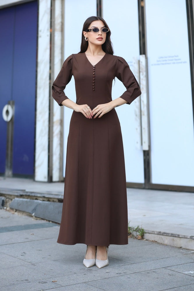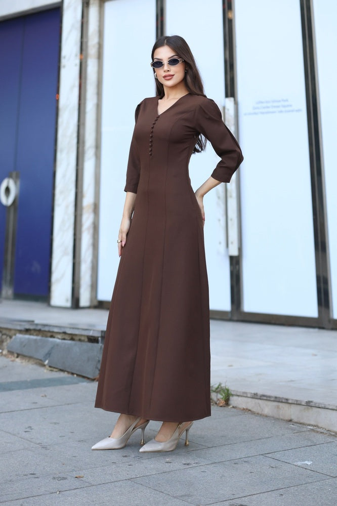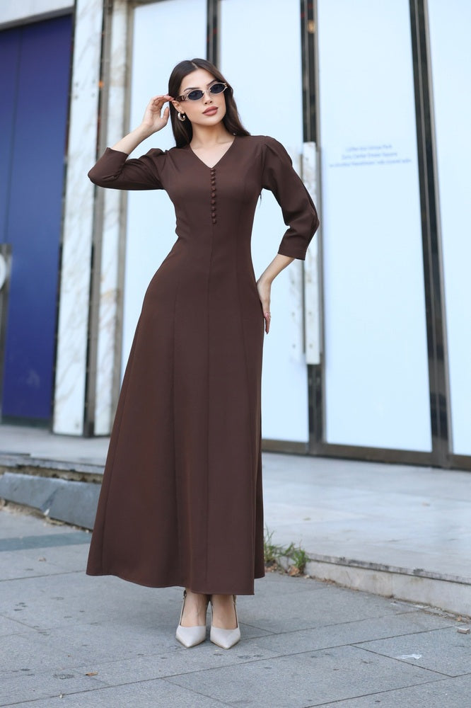 V Yaka Önü Düğme Detaylı Belden Oturan Uzun Boy Günlük Özel Gün Kadın Elbise