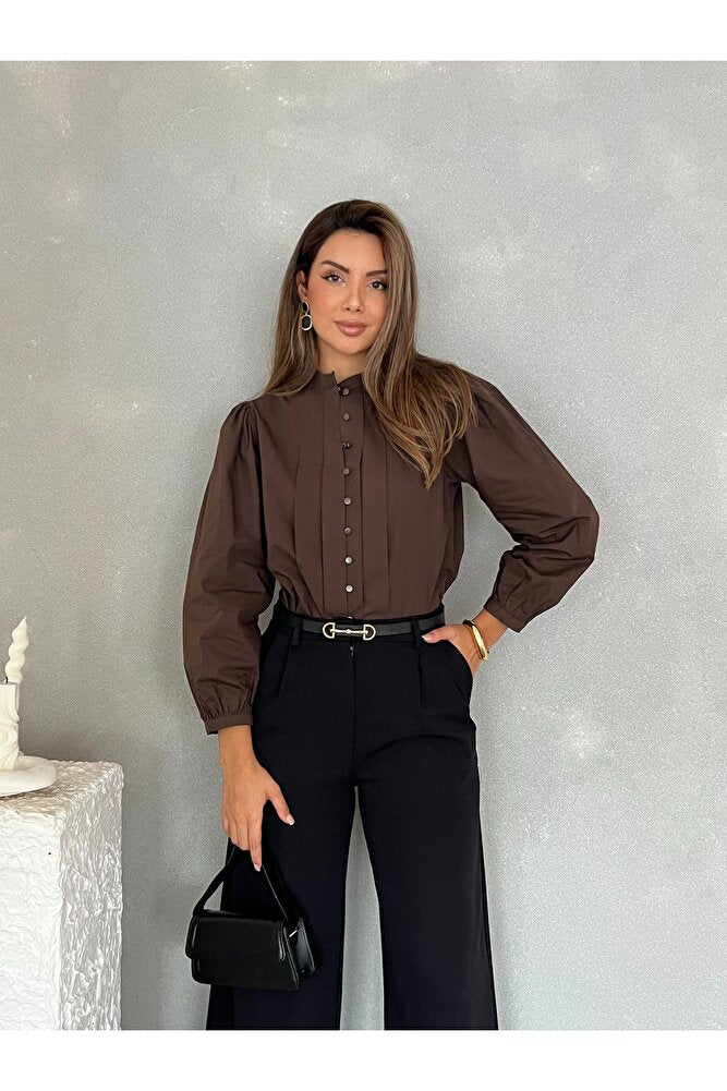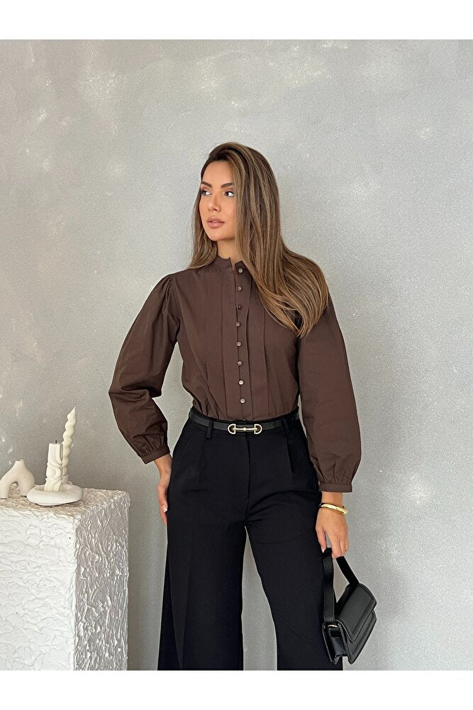Önü Pileli Balon Kol Günlük Şık Gece Kadın Gömlek