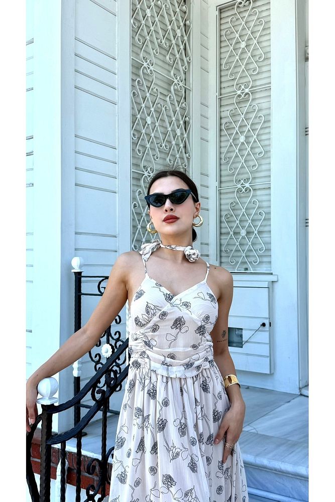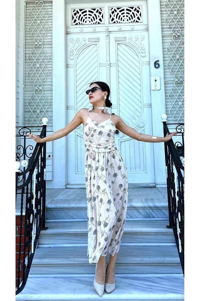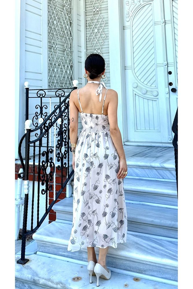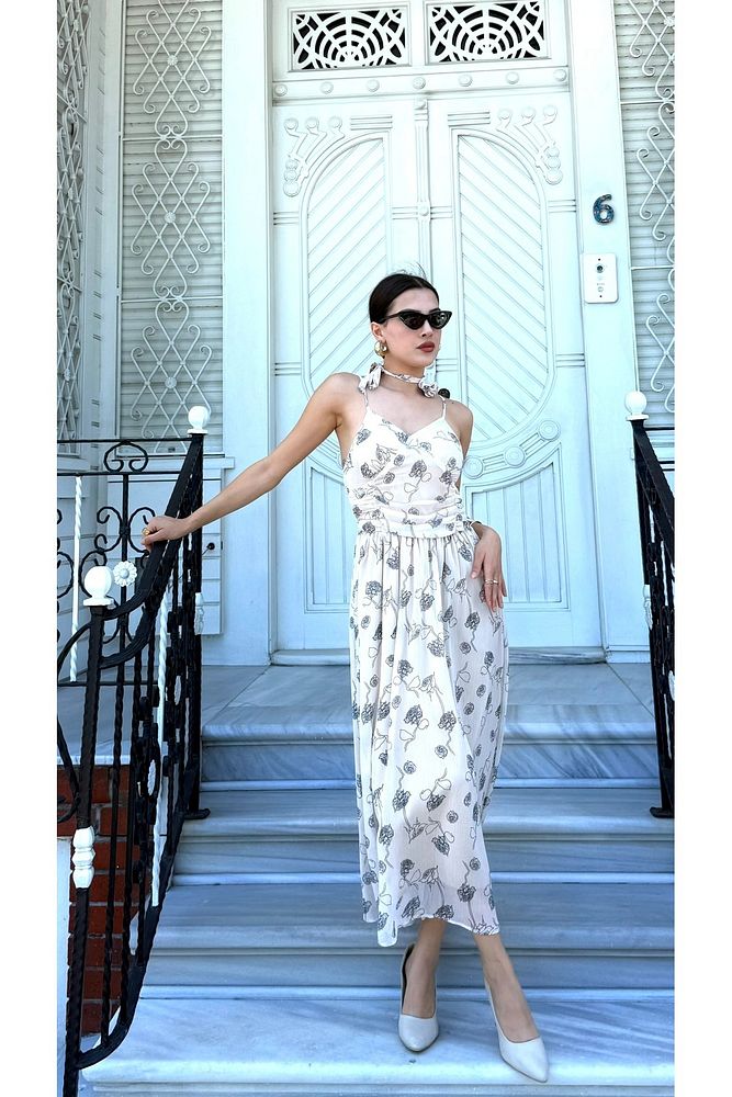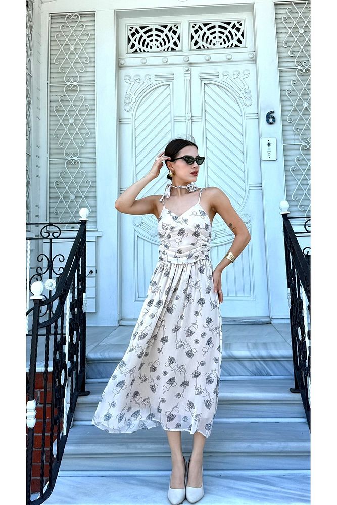 Desenli Boyundan Gül Bağlama Detaylı Askılı Kadın Özel Gün Günlük Elbise