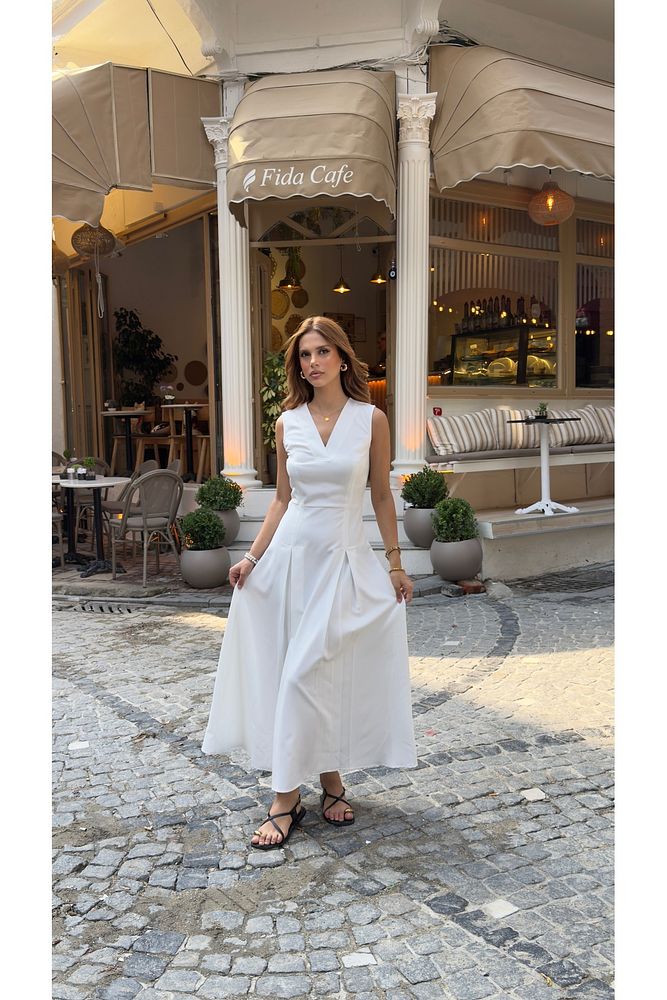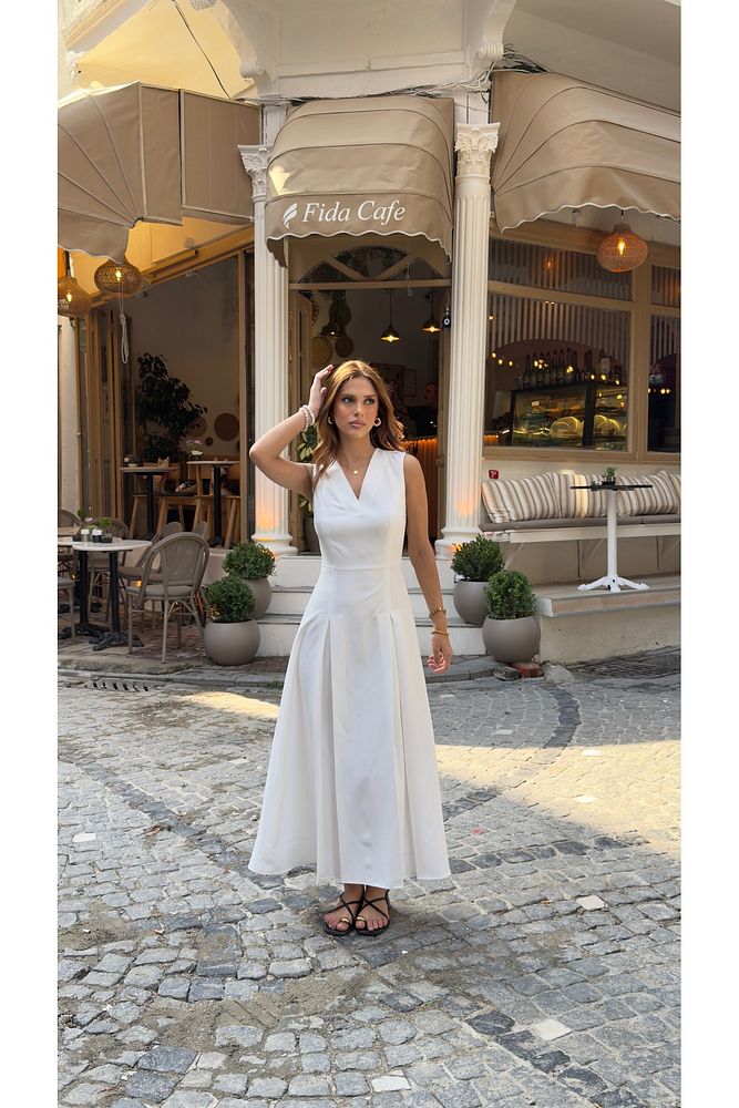 V Yaka Kolsuz Belden Oturan Atlas Maxi Kadın Günlük Özel Gün Elbise