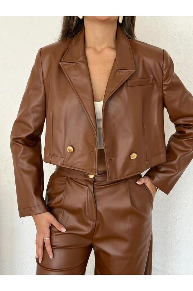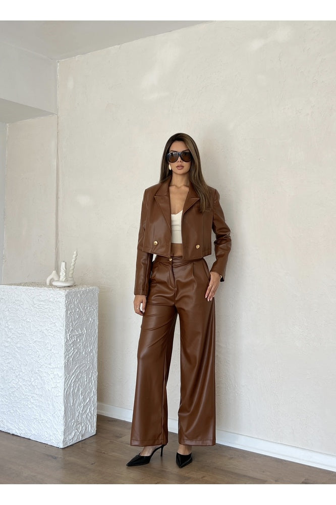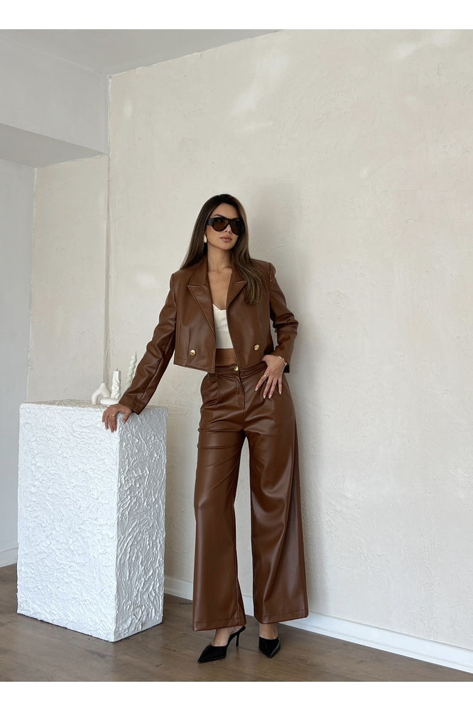 Kadın Deri Astarlı Kısa Ceket Pantolon Takım