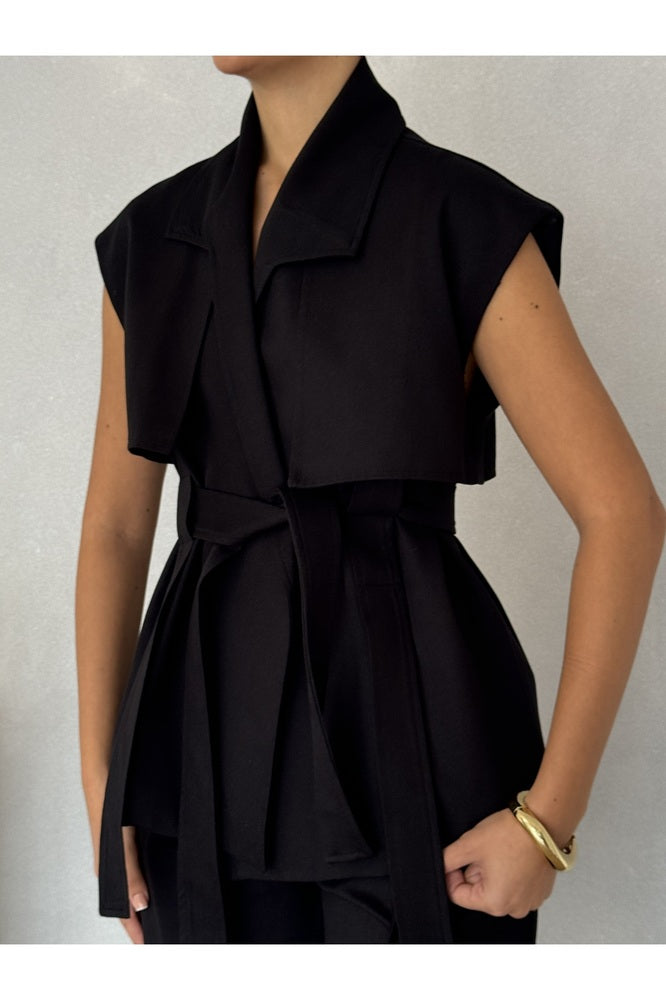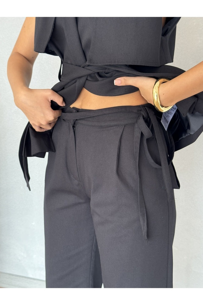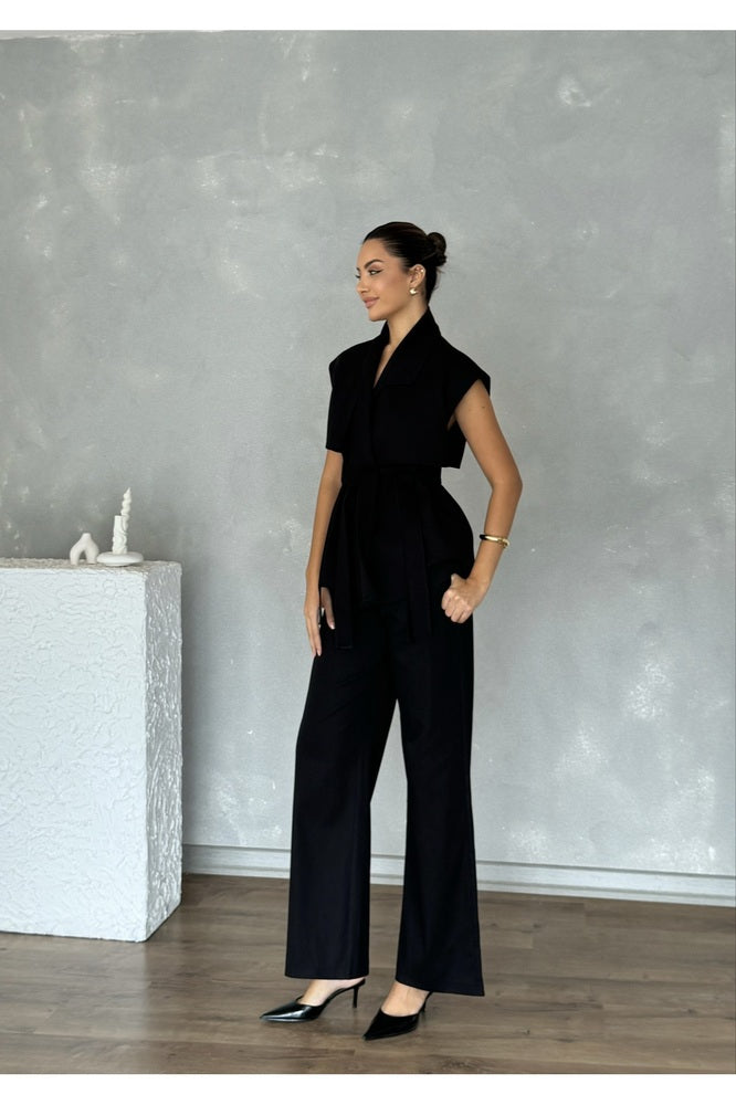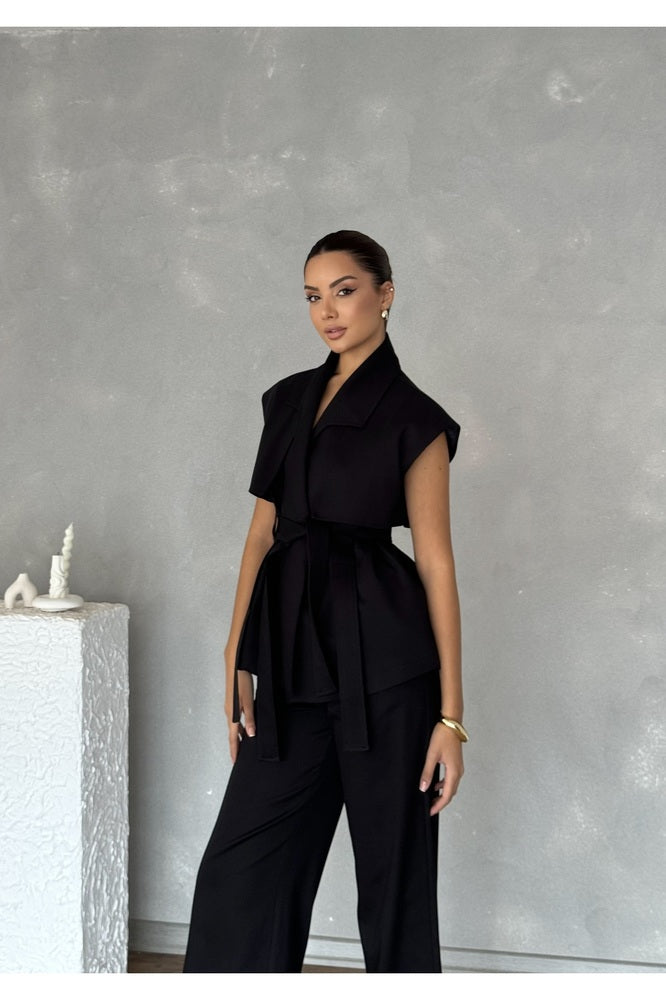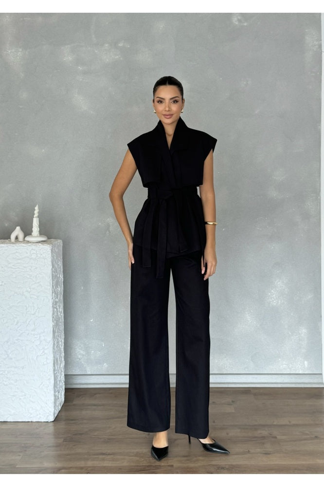 Rüzgarlık Detaylı Kuşaklı Kolsuz Kadın Şık Klasik Günlük Nişan Düğün Pantolon Yelek Takım