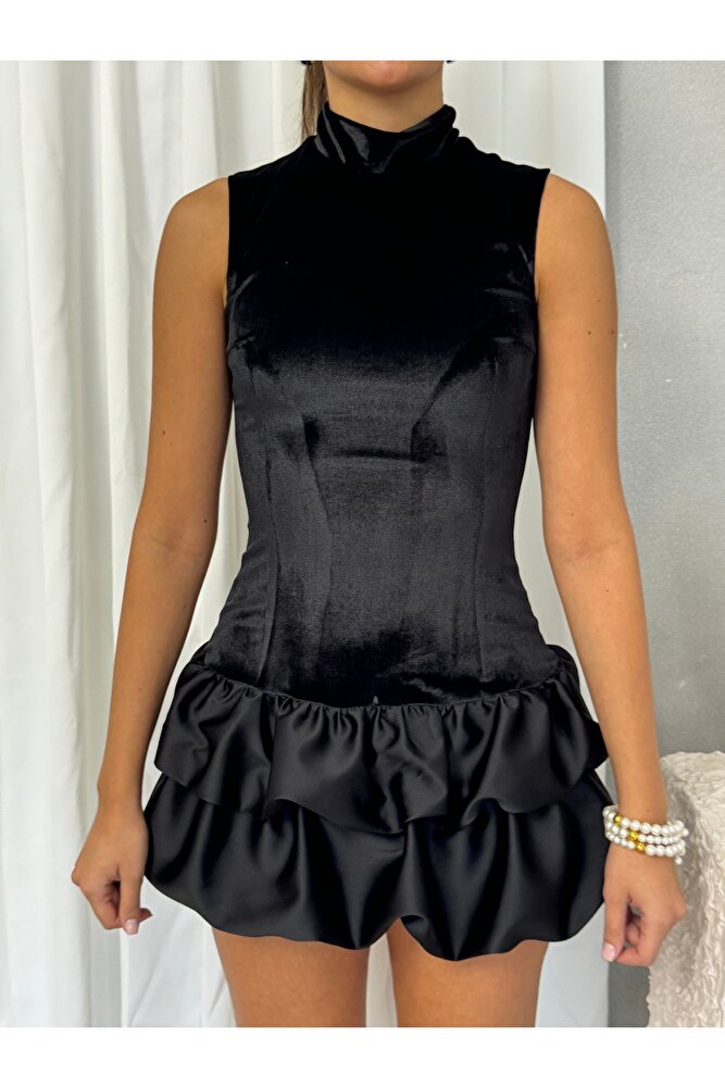 - Kolsuz tasarımı ile yaz aylarında serinlik ve rahatlık sunar.; - Orta kalınlıkta kadife kumaşı, mevsim geçişlerinde ideal bir tercih olur.; - Şık ve gece ortamları için uygun, göz alıcı bir görünüm sağlar.; - Cepsiz yapısı ile minimalist ve zarif bir siluet oluşturur.; - Boğazlı yaka tipi, modern ve sofistike bir dokunuş ekler.; - Astarlı yapısı sayesinde rahat bir kullanım sunar ve vücut hatlarını nazikçe sarar.; - Kemersiz tasarımı, elbisenin doğal akışına odaklanır ve zarif bir görünüm kazandırır.; - Tüm sezonlar için uygun olan bu elbise, gardırobunuzun vazgeçilmezi olacak.; - Fermuarlı kapama şekliyle pratik kullanım imkanı tanır.; - Kadın/Kız kullanıcılar için özel olarak tasarlanmıştır.; - Dokuma kumaşı dayanıklılık ve konforu bir arada sunar.; - Yetişkin yaş grubuna hitap eden bu elbise, her yaş grubundan kadının tercihi olabilir.; - Mini boyu ile dinamik ve genç bir stil vurgular.; - Türkiye menşeli olmasıyla yerel üretim desteklenmiş olurken kaliteyi de ön plana çıkarır.; - Slim kalıbı vücut hatlarınıza mükemmel uyum sağlayarak şık bir siluet çizer.; Tam kalıptır kendi bedeninizi tercih edebilirsiniz son görselde detaylı ölçü tablosu mevcuttur.; Manken boyu 178 kilo 63 S beden giyilmiştir.;