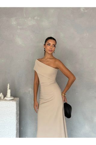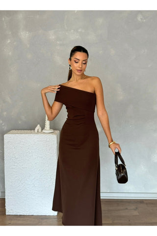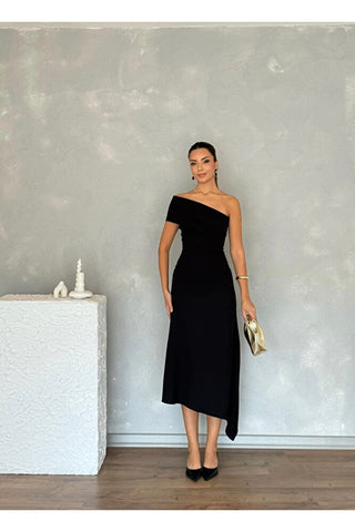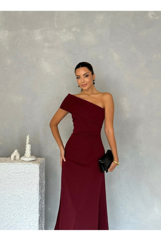 Tek Omuz Eteği Asimetrik Kesim Vücudu Saran Uzun Lunara Gece Elbisesi