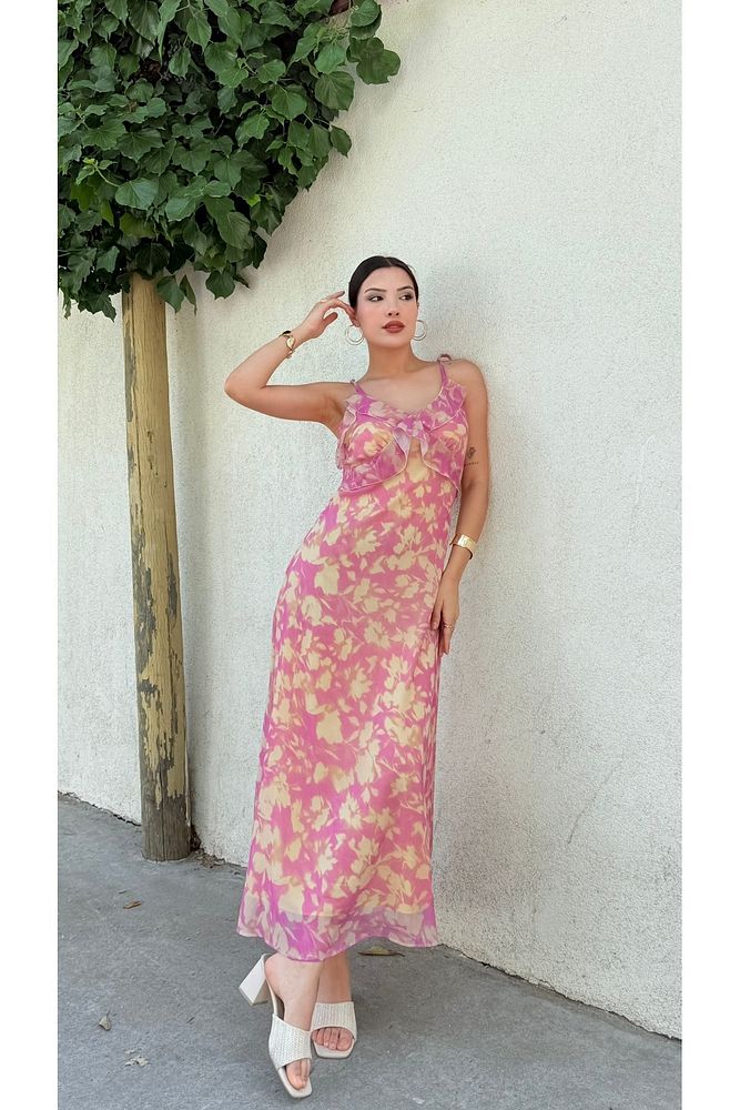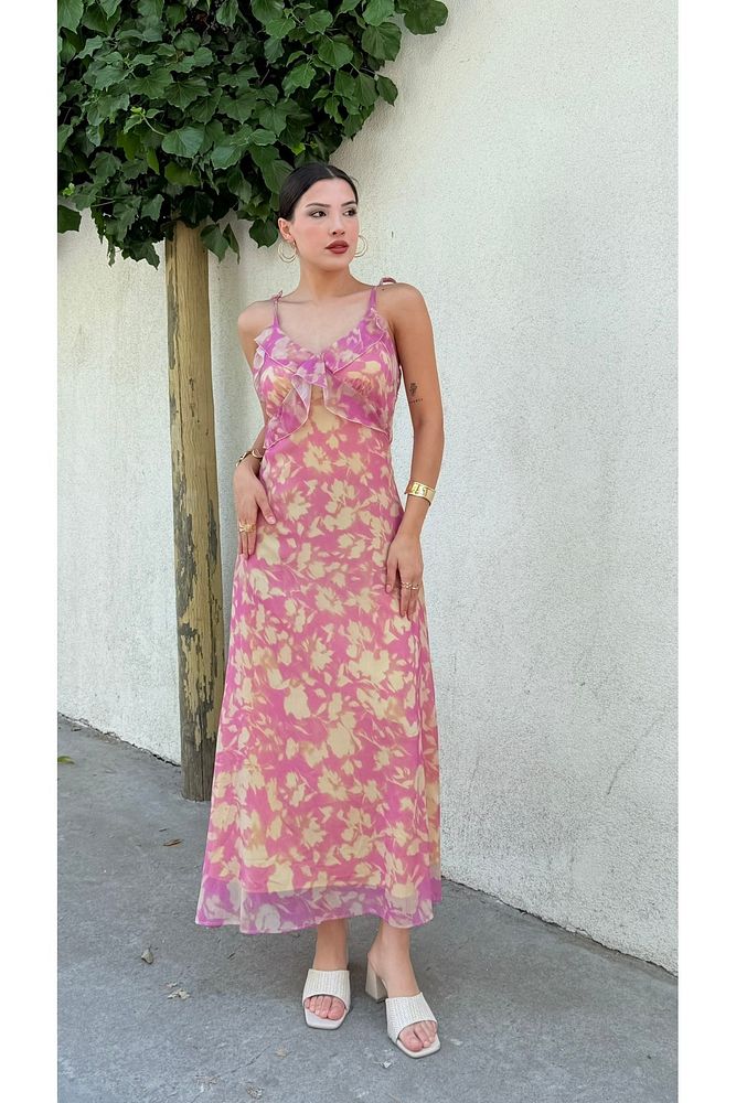 Desenli Askılı Uzun Boy Renkli Kadın Elbise