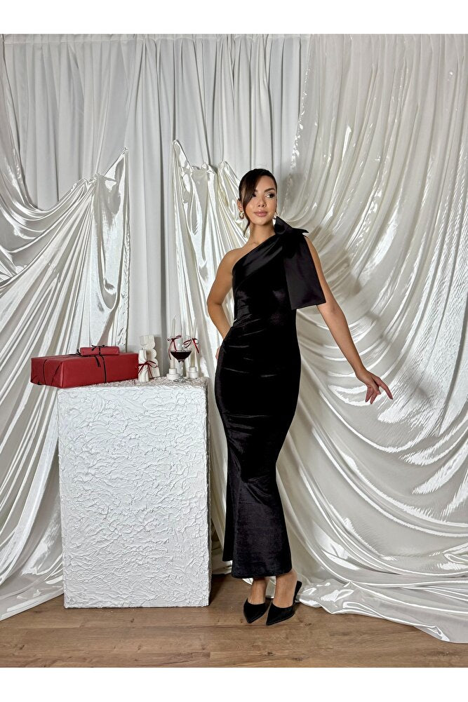 Saten Fiyonklu Eteği Yırtmaçlı Kadife Kadın Silvera Elbise