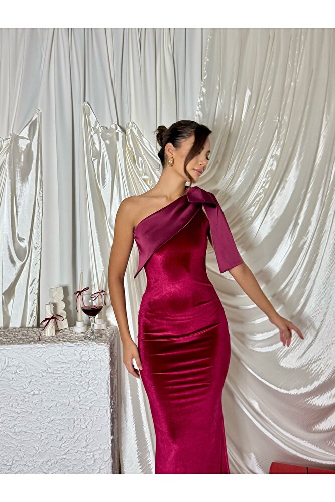 Saten Fiyonklu Eteği Yırtmaçlı Kadife Kadın Silvera Elbise